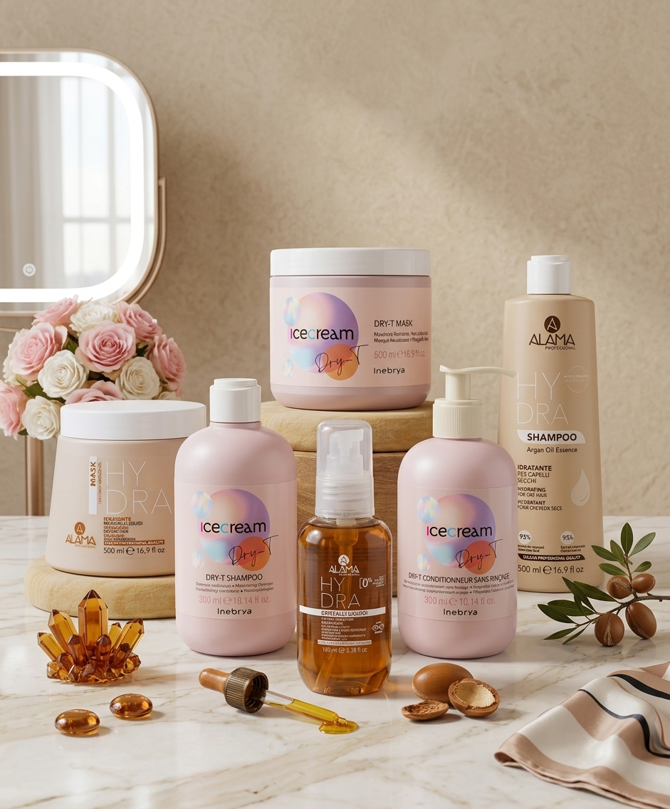 - Gamme Inebrya Dry-T : Shampooing (300ml) + Masque (500ml) + Soin sans rinçage (300ml).